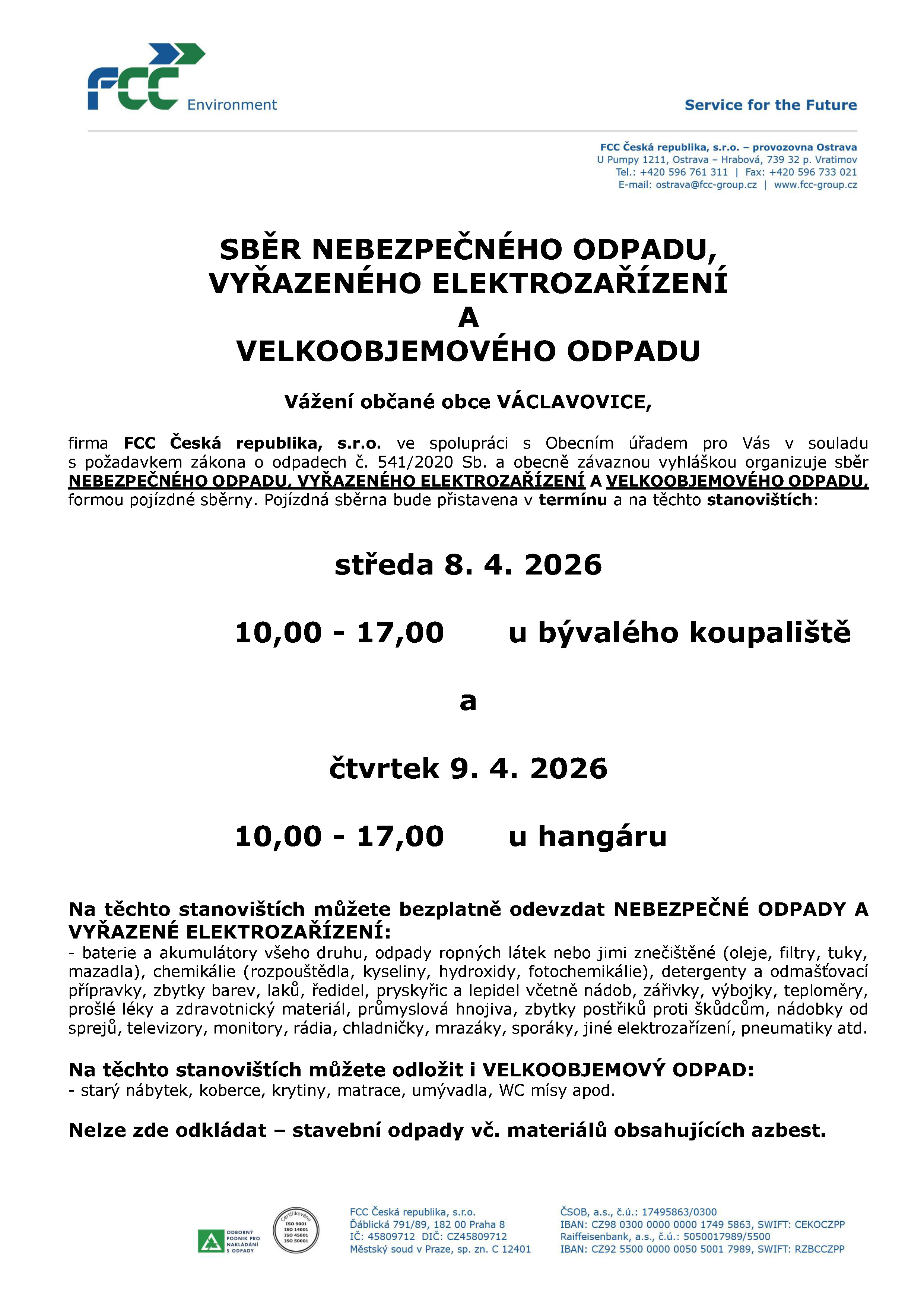 Sběr nebezpečného odpadu 8. a 9. 4. 2026