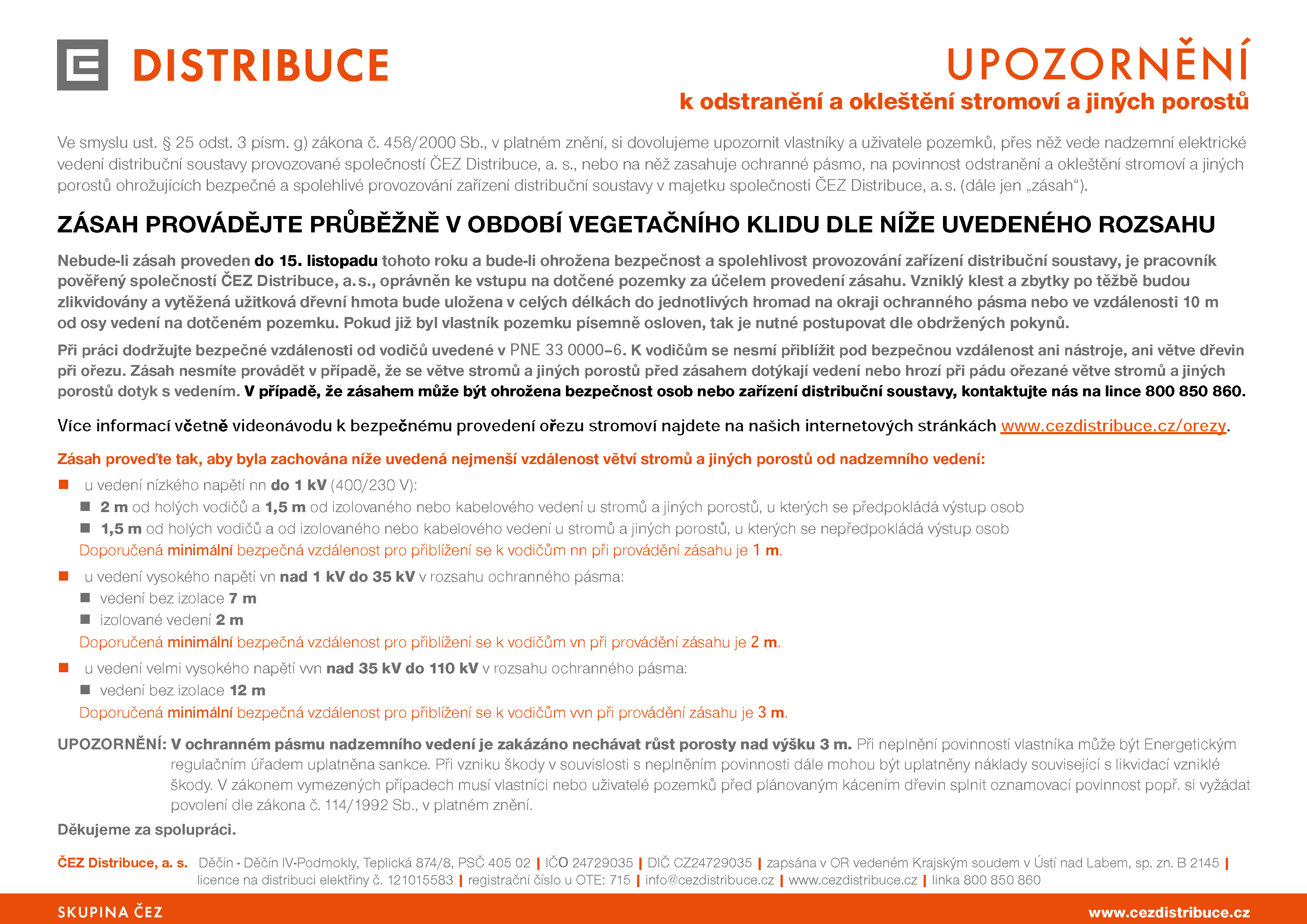 UPOZORNĚNÍ k odstranění a okleštění stromoví a jiných porostů