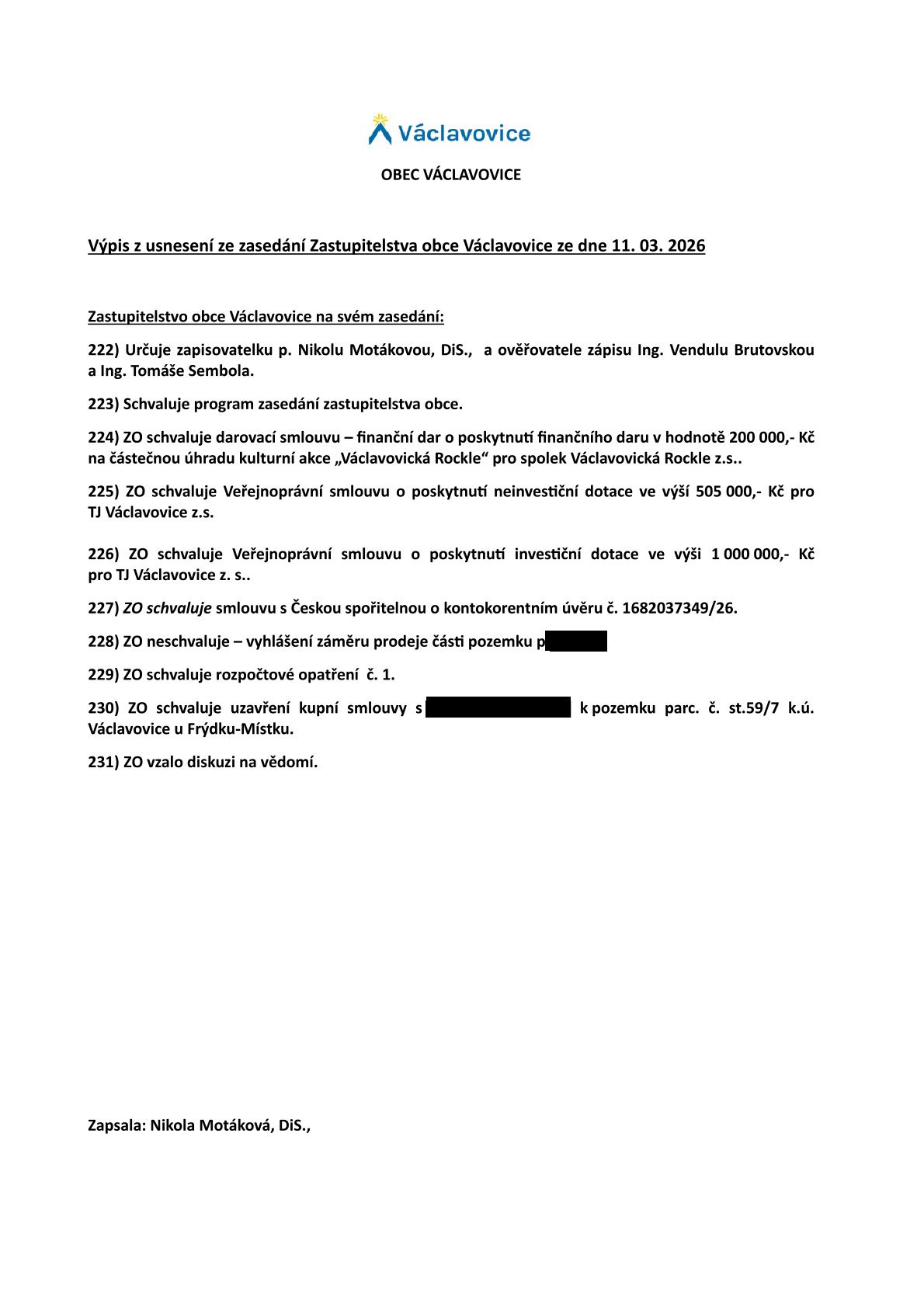 Výpis usnesení ze zasedání ZO 11.3.2026