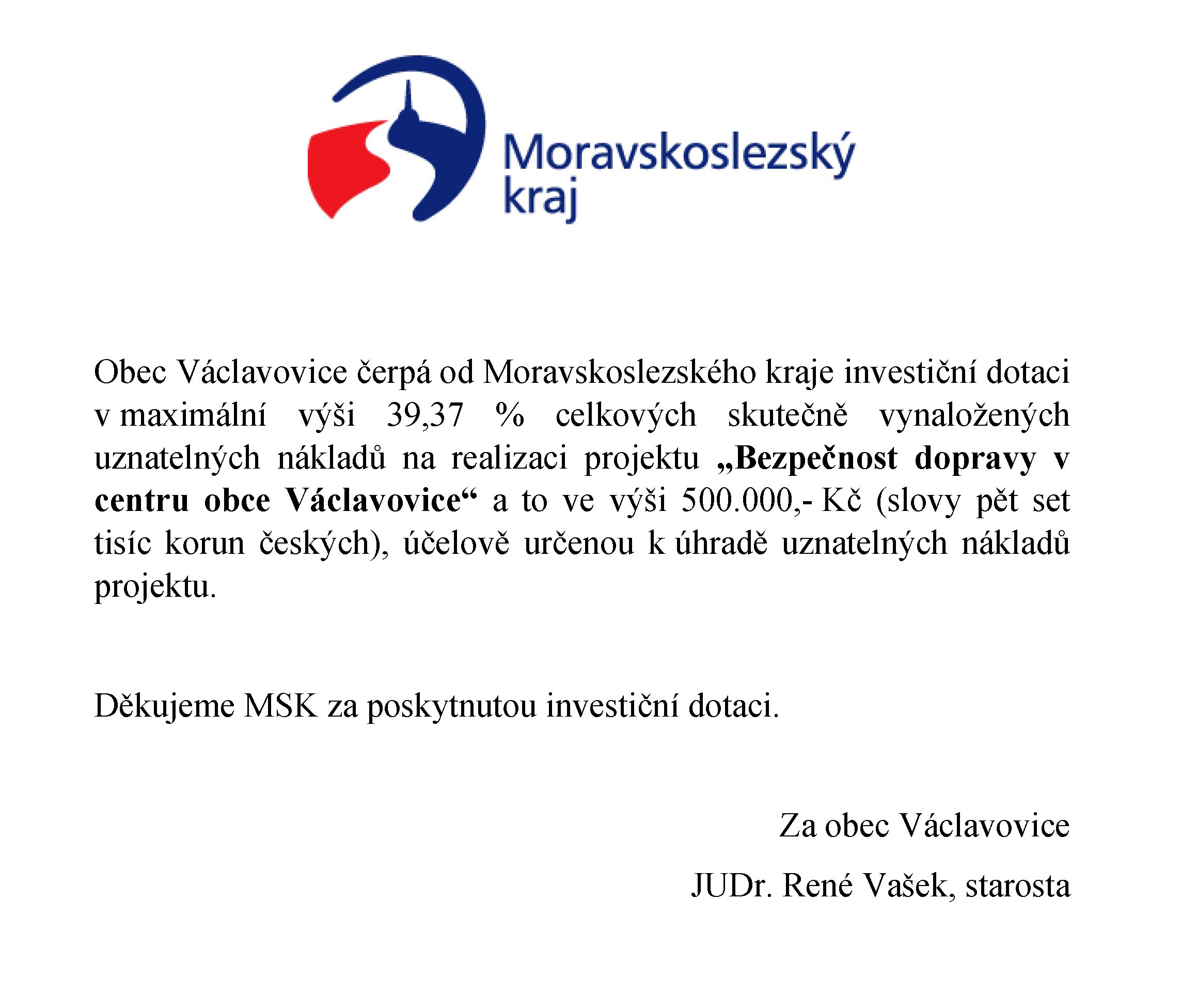 Spolufinancování projektu „Bezpečnost dopravy v centru obce Václavovice“